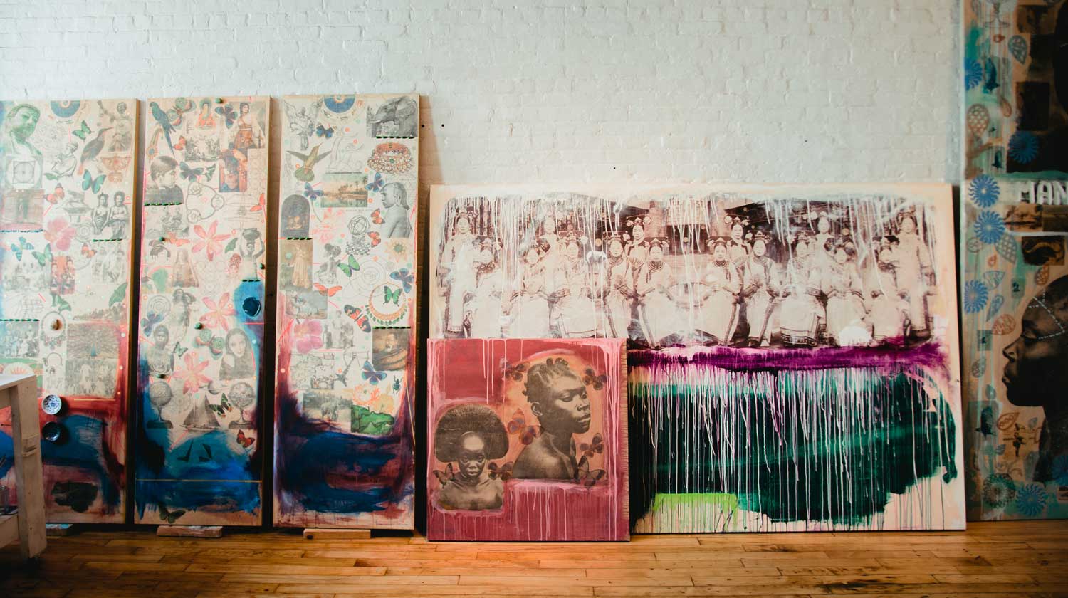 Inspiration — My home is a reflection of my databank of over 10,000 images, which convey three different themes: The connectedness of diverse peoples through a common humanity, the questions about cultural values and imperialist ideas and the collective yearning for transcendence. I would like someone entering my space to feel like I do when I create - traveling in a dreamlike state across cultures, time and memory. One participates in my narratives via transferred early 19th and 20th century portraits of people from every continent loosely organized amid images of diverse flora, fauna, fabric and cultural signifiers. Similarly in my home, I love the juxtaposition of modern design like my worn Corbusier armchair next to rare African headrest demonstrating the fluidity of culture.