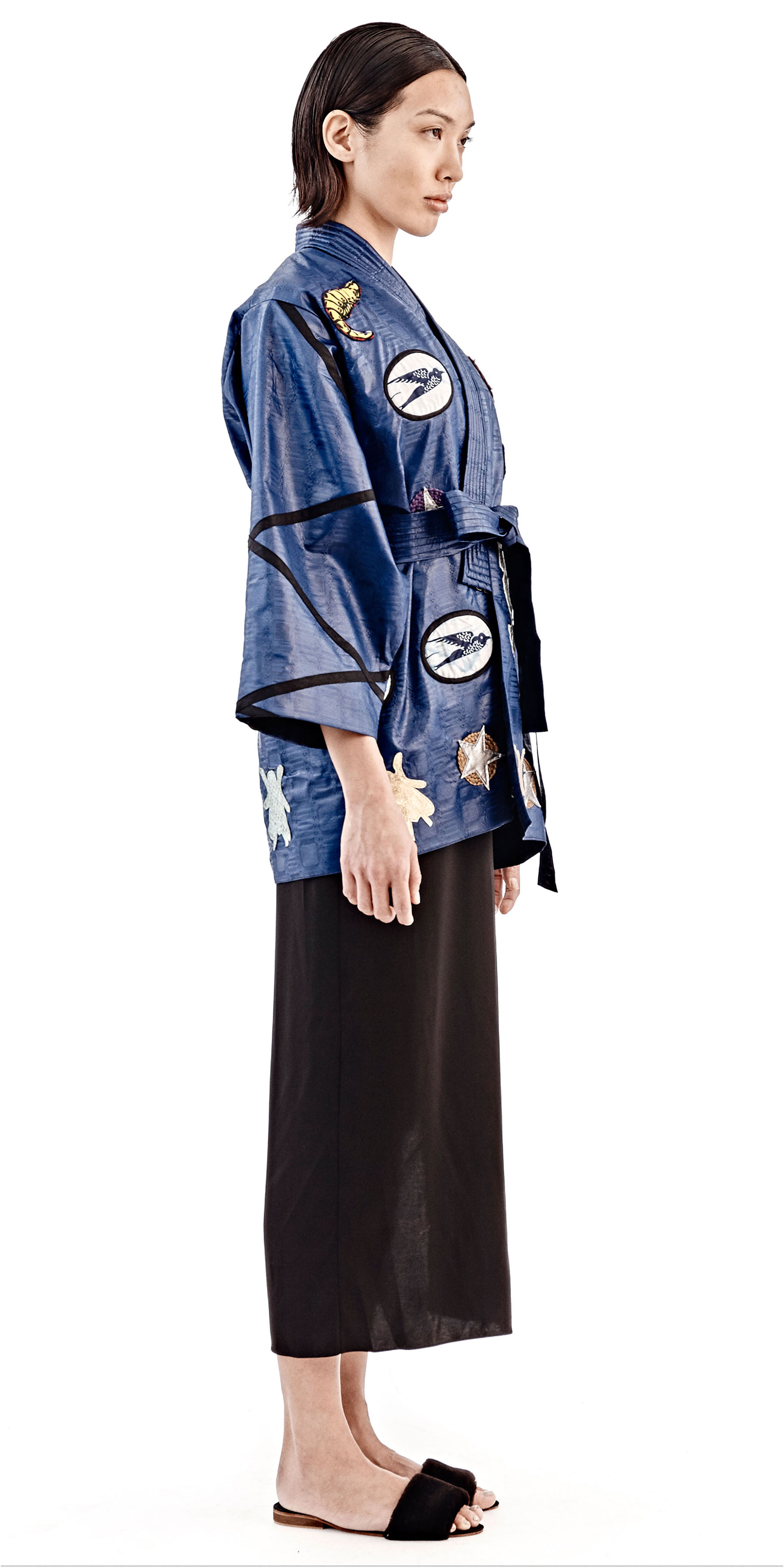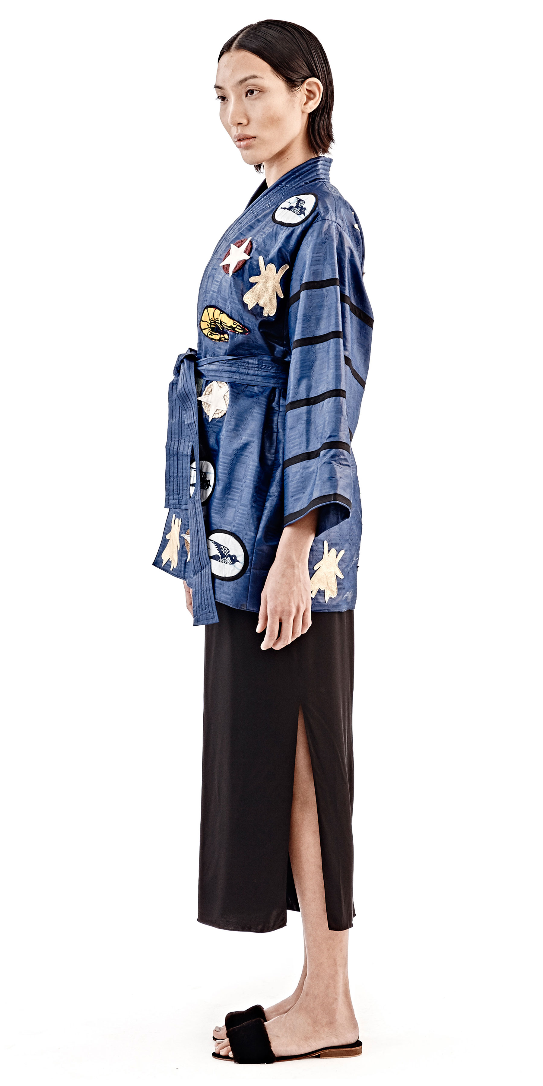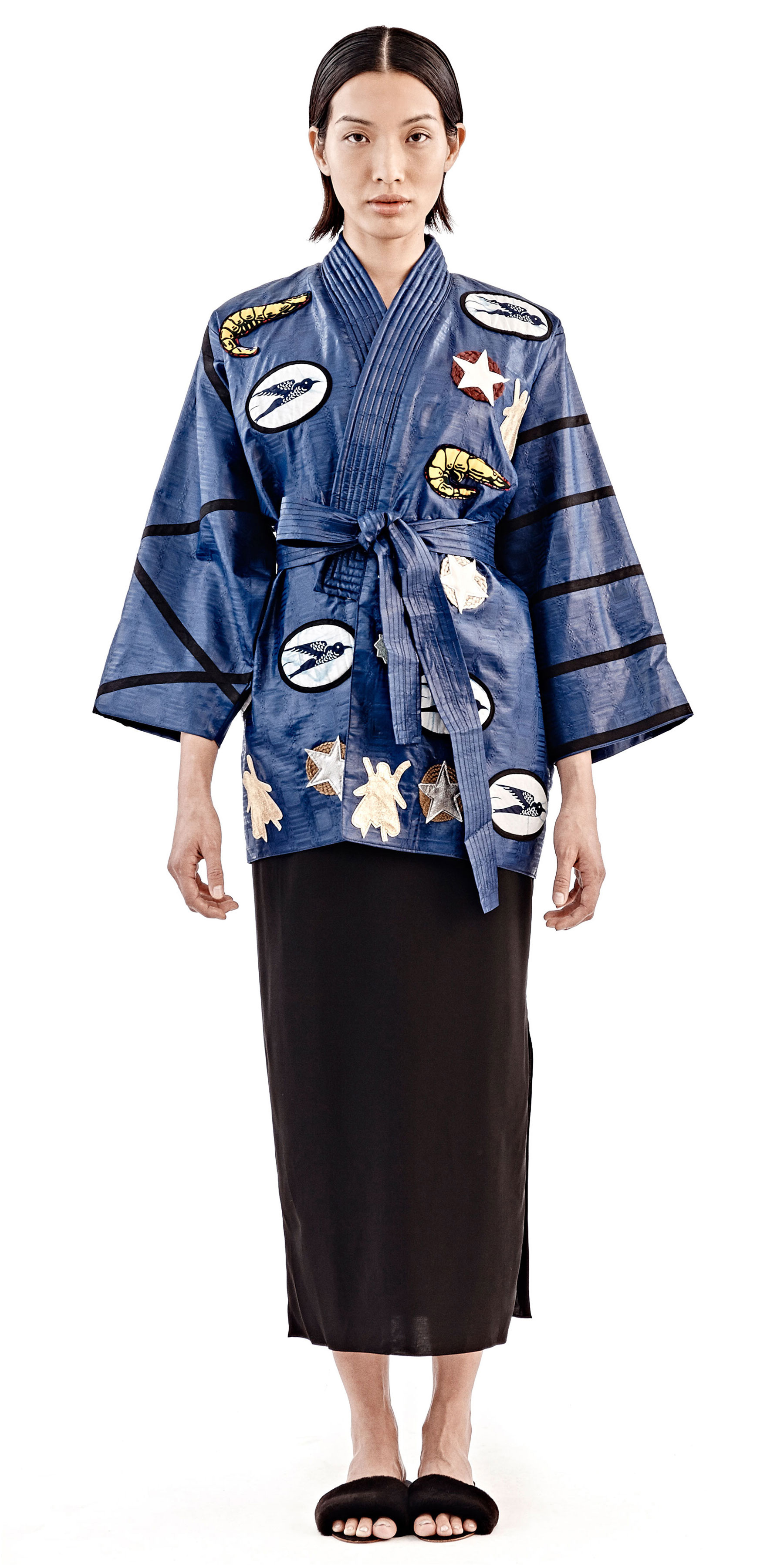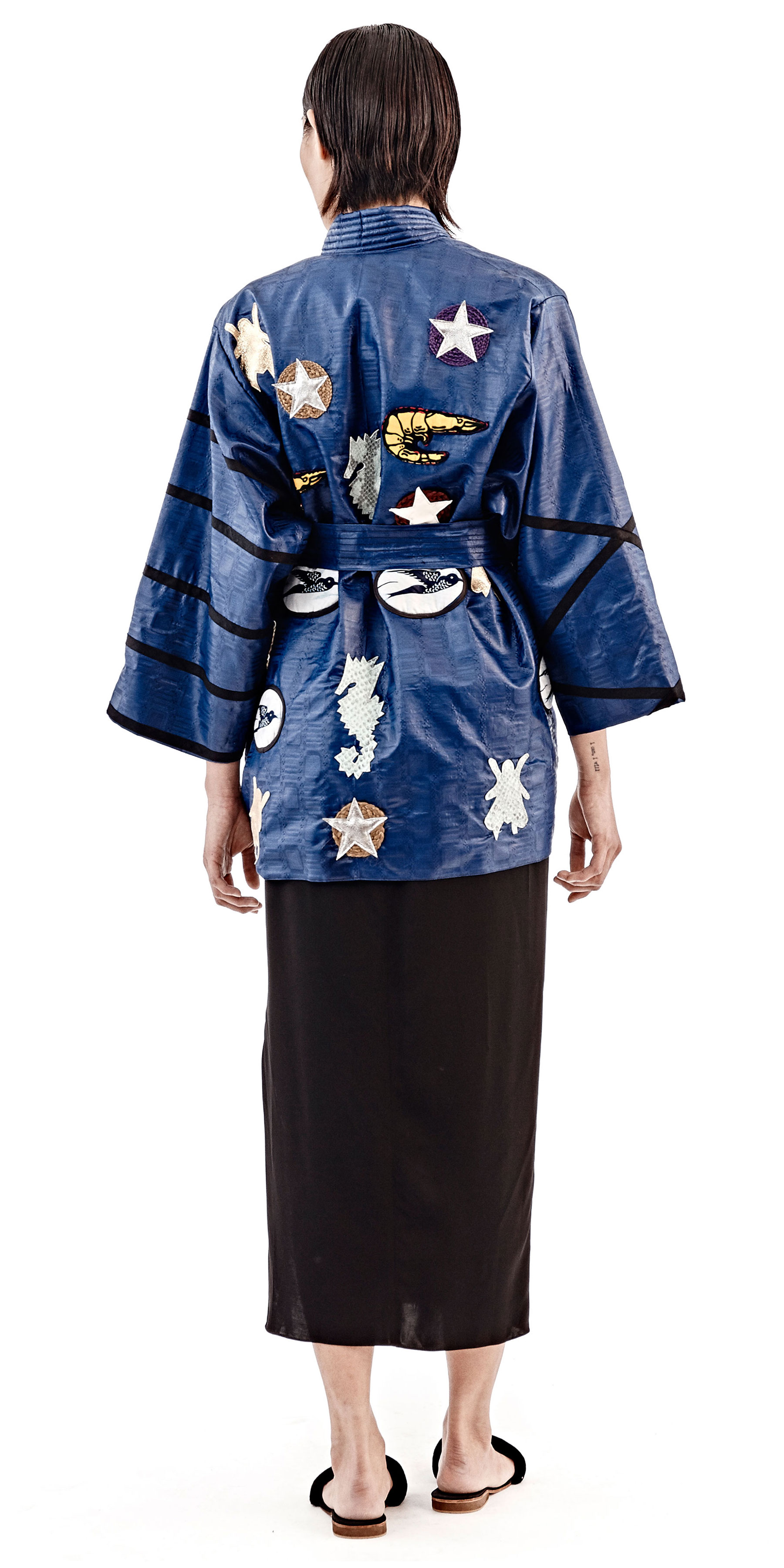 Selly Raby Kane Blue Schrimp Kimono / three-fourth sleeve kimono in blue / open front / detachable belt tie at waist / faux leather finish / quilted wax appliqués throughout / 93% cotton / 3% leather / 2% polyester / made in Dakar, Senegal