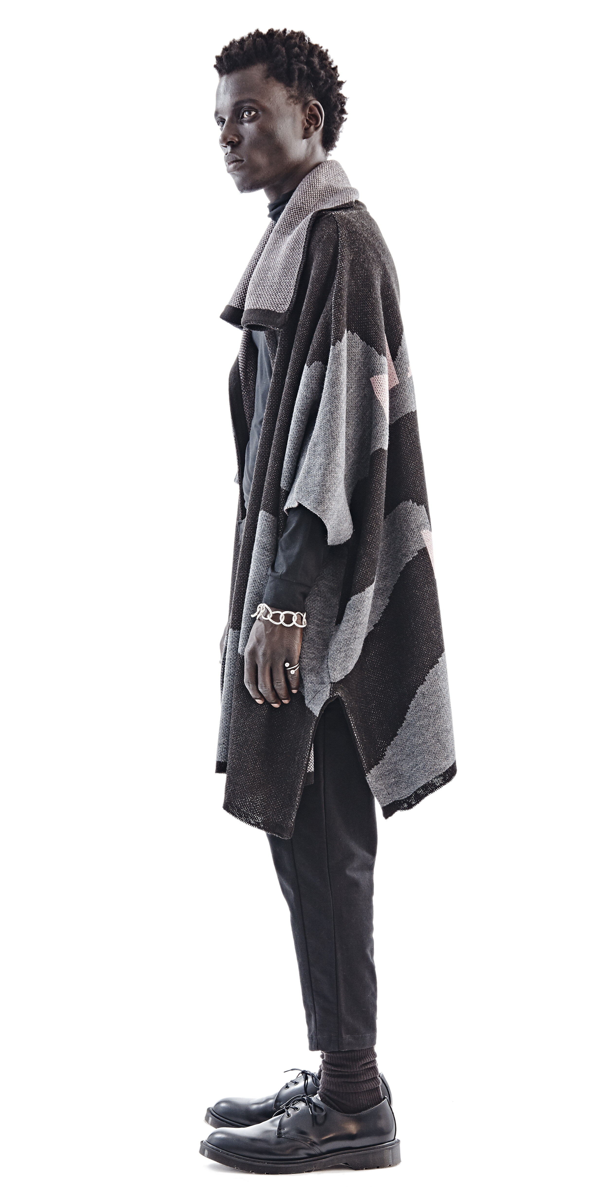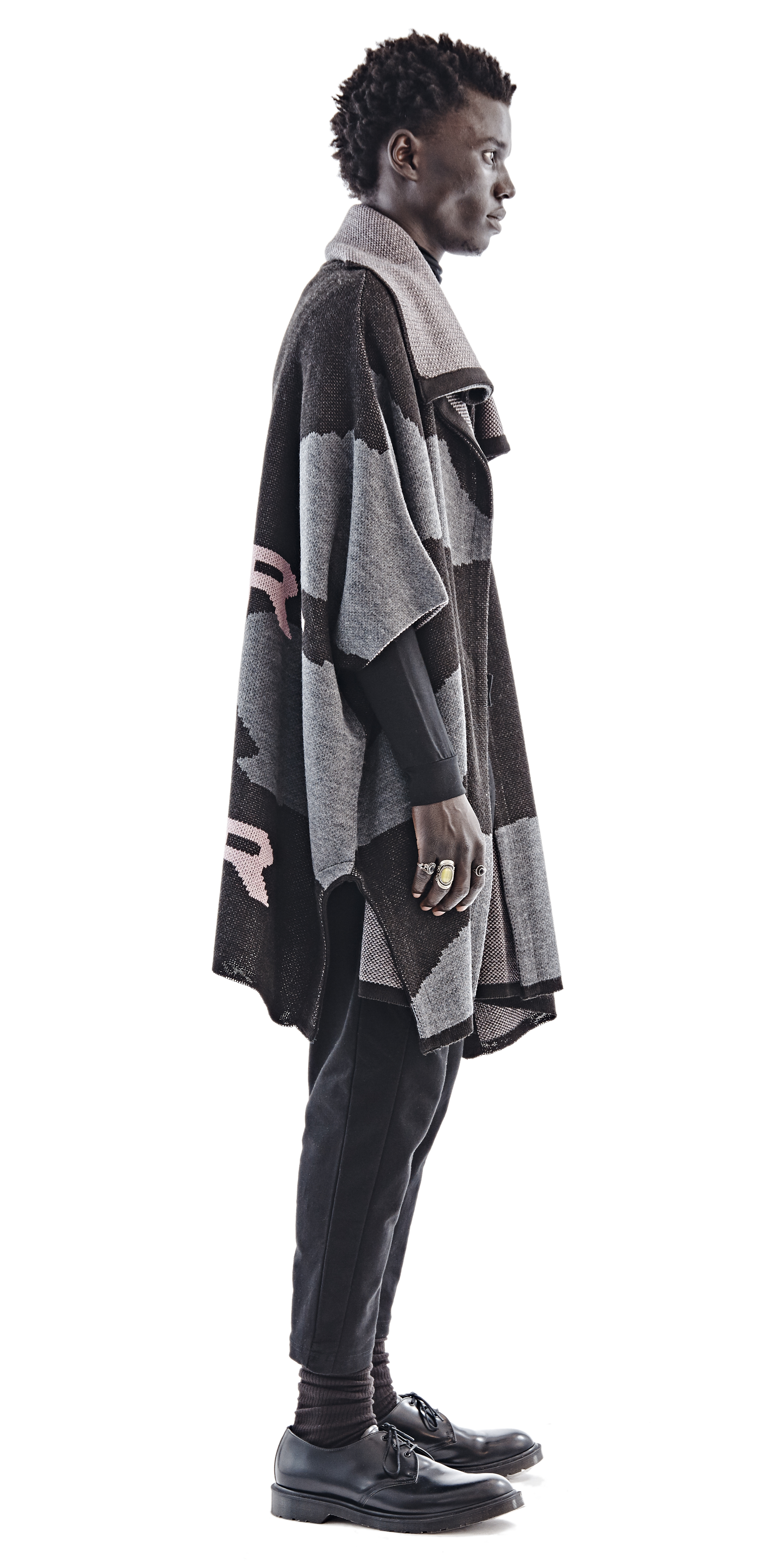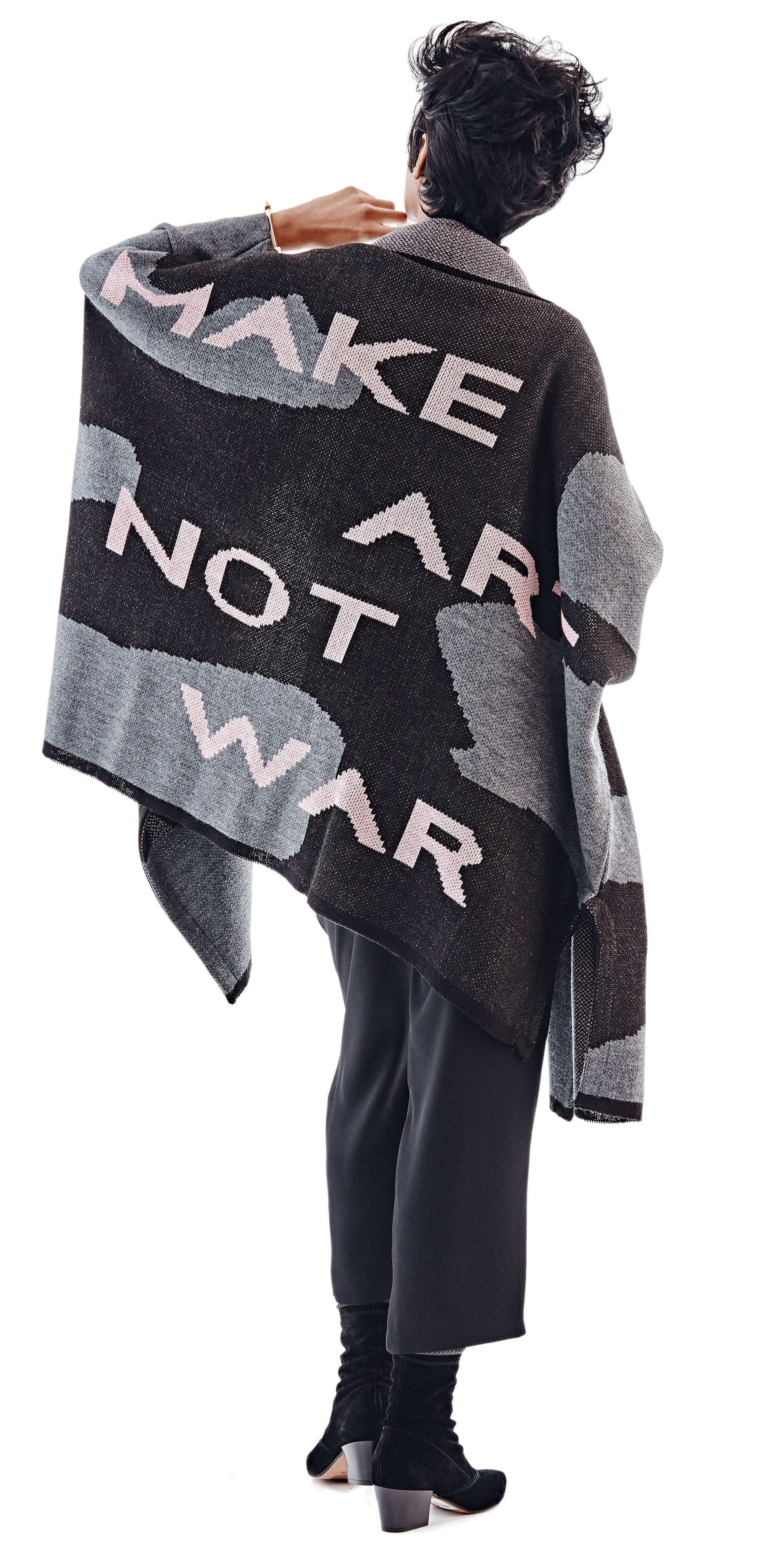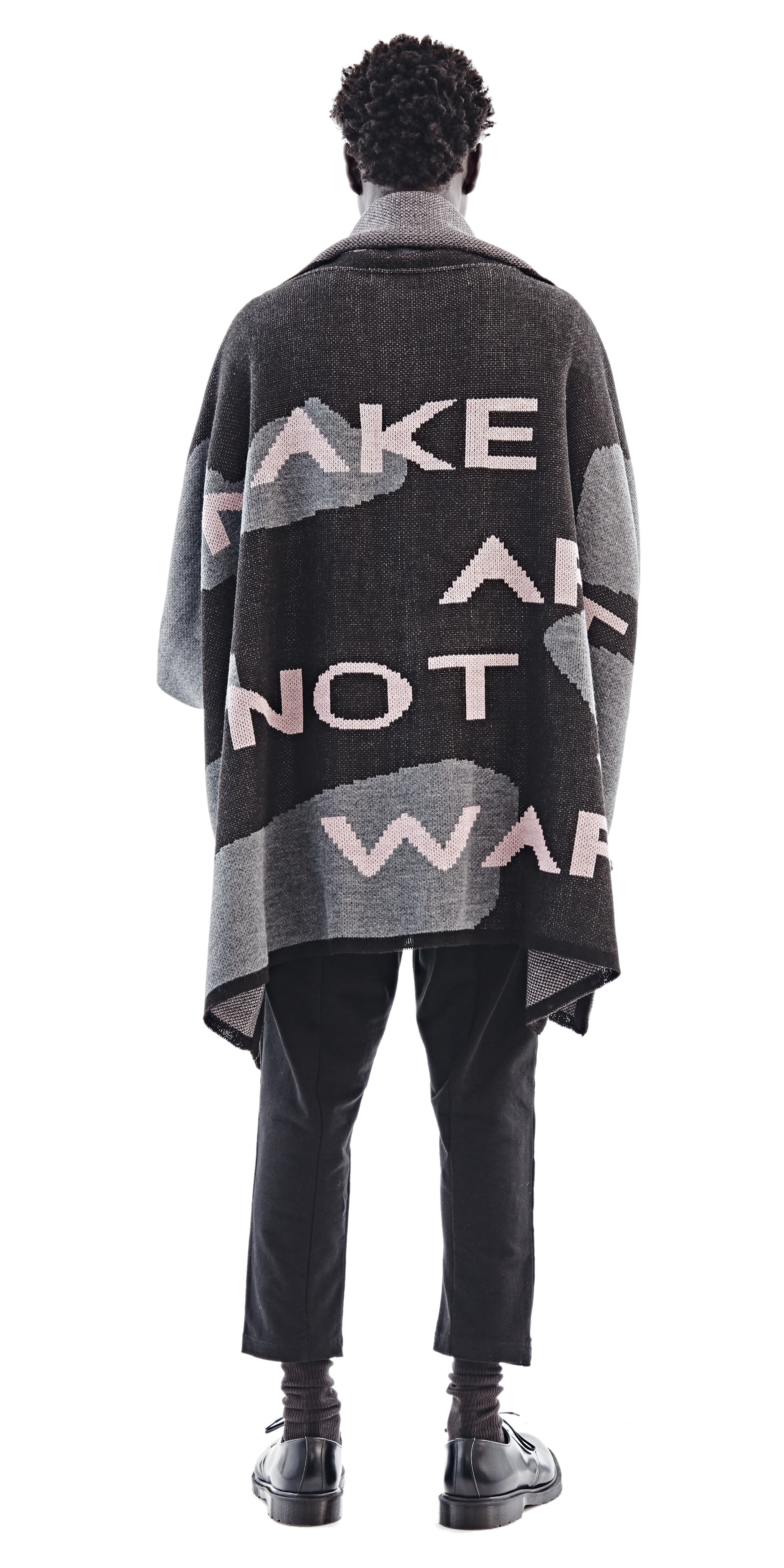 Chulaap Charcoal "Make Art Not War" Poncho / heavyweight knit / Dusty Pink "Make Art Not War" Print at back / 100% acrylic / made in Cape Town, South Africa