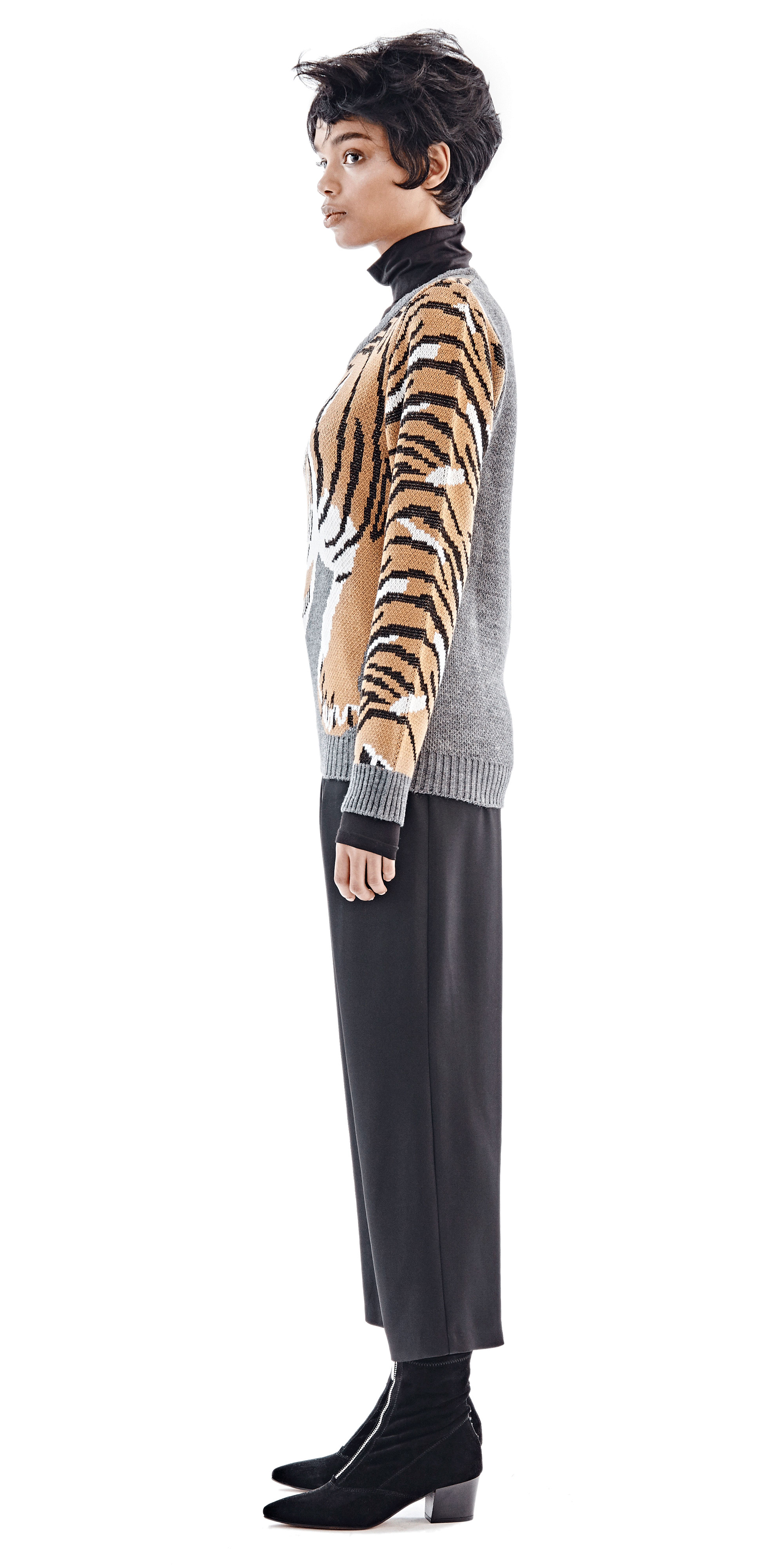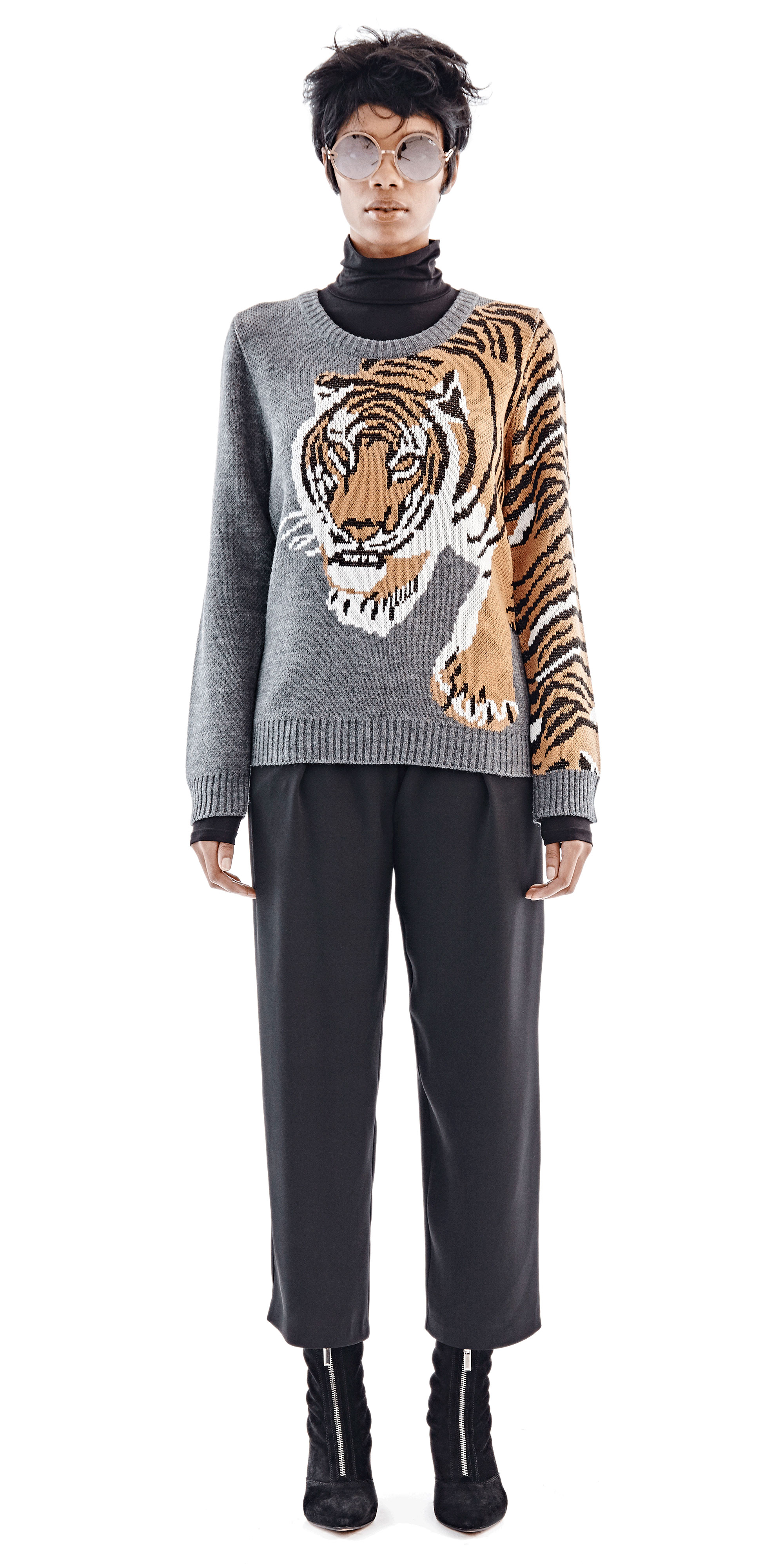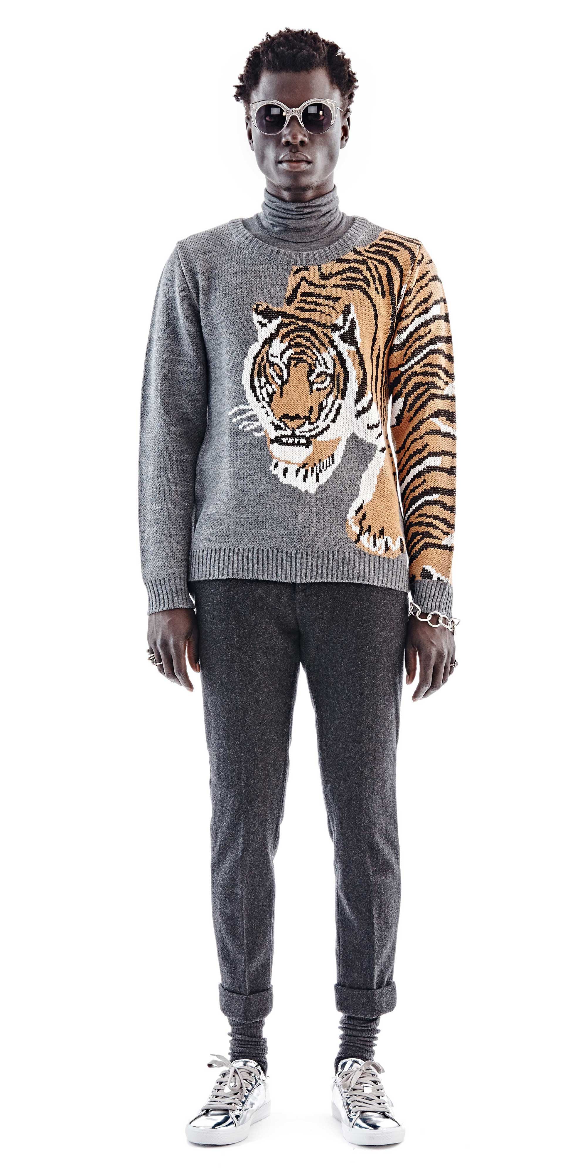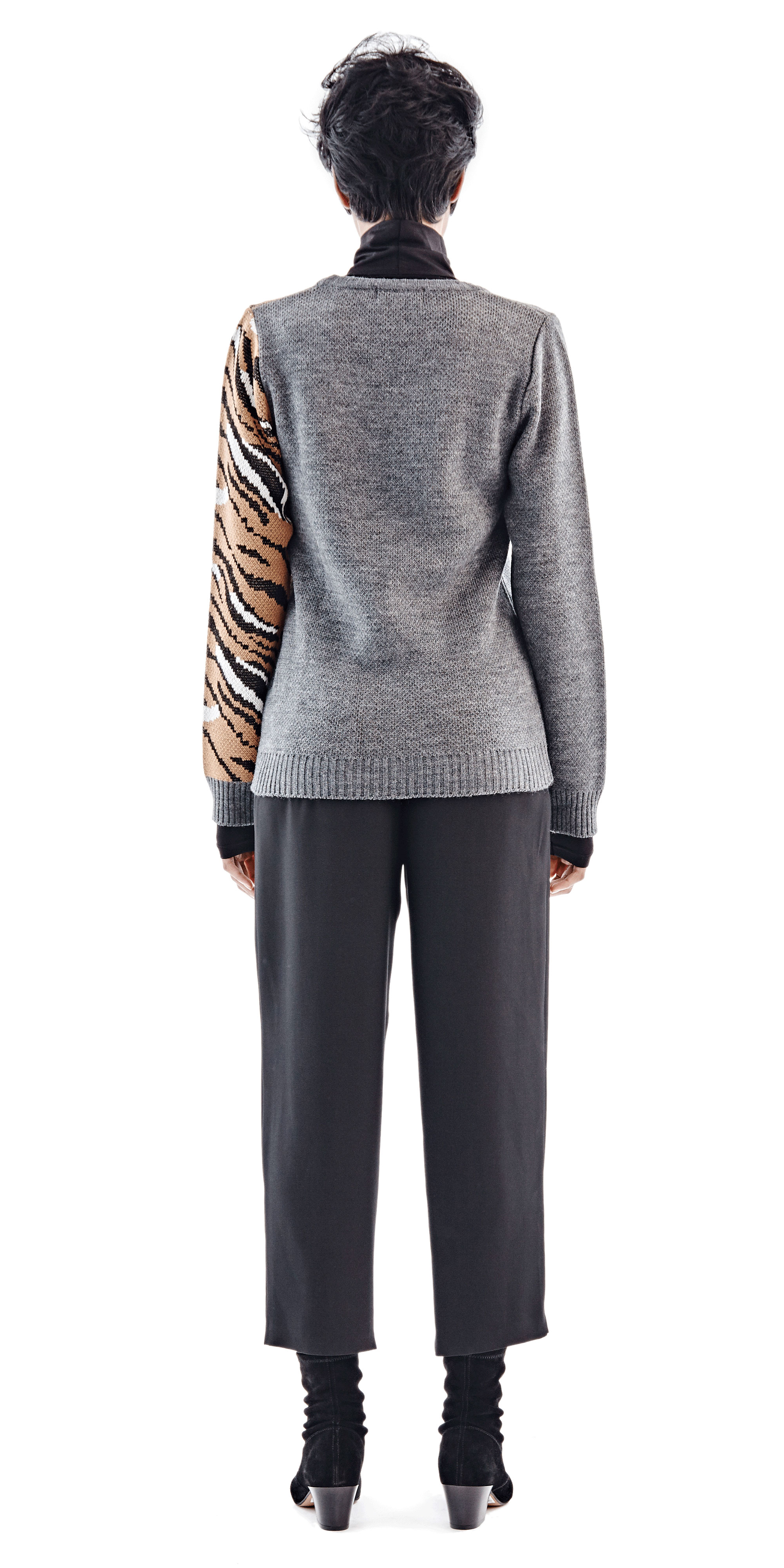 Chulaap Charcoal Tiger Sweater / u-neck collar / long-sleeves / knit tiger design / ribbed cuffs and hem / 100% acrylic / made in Cape Town, South Africa