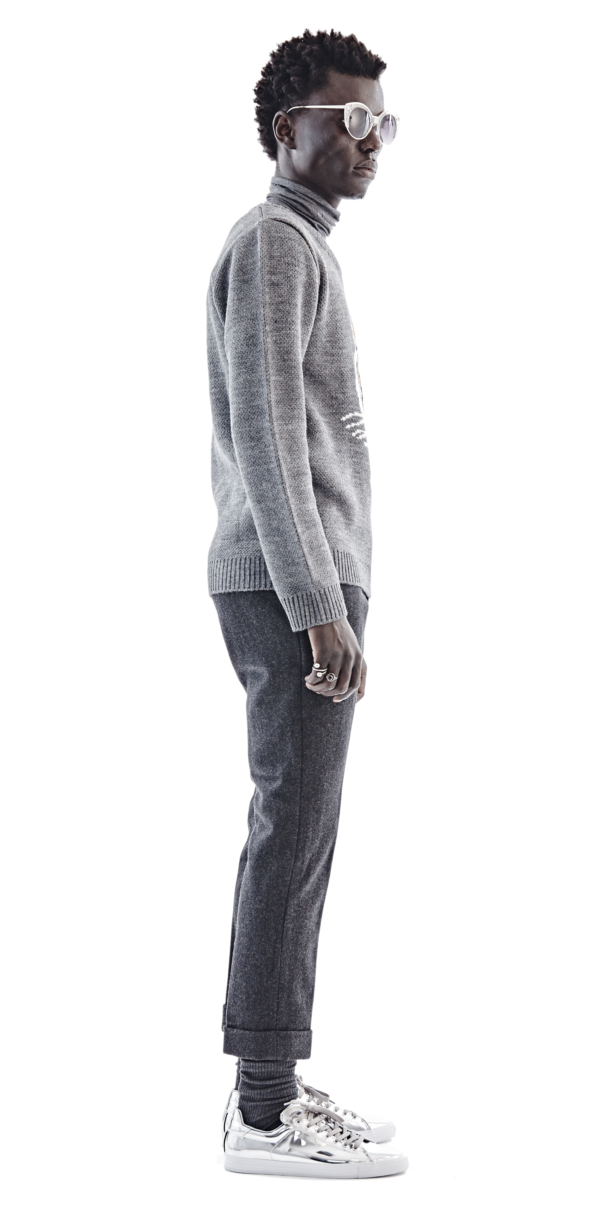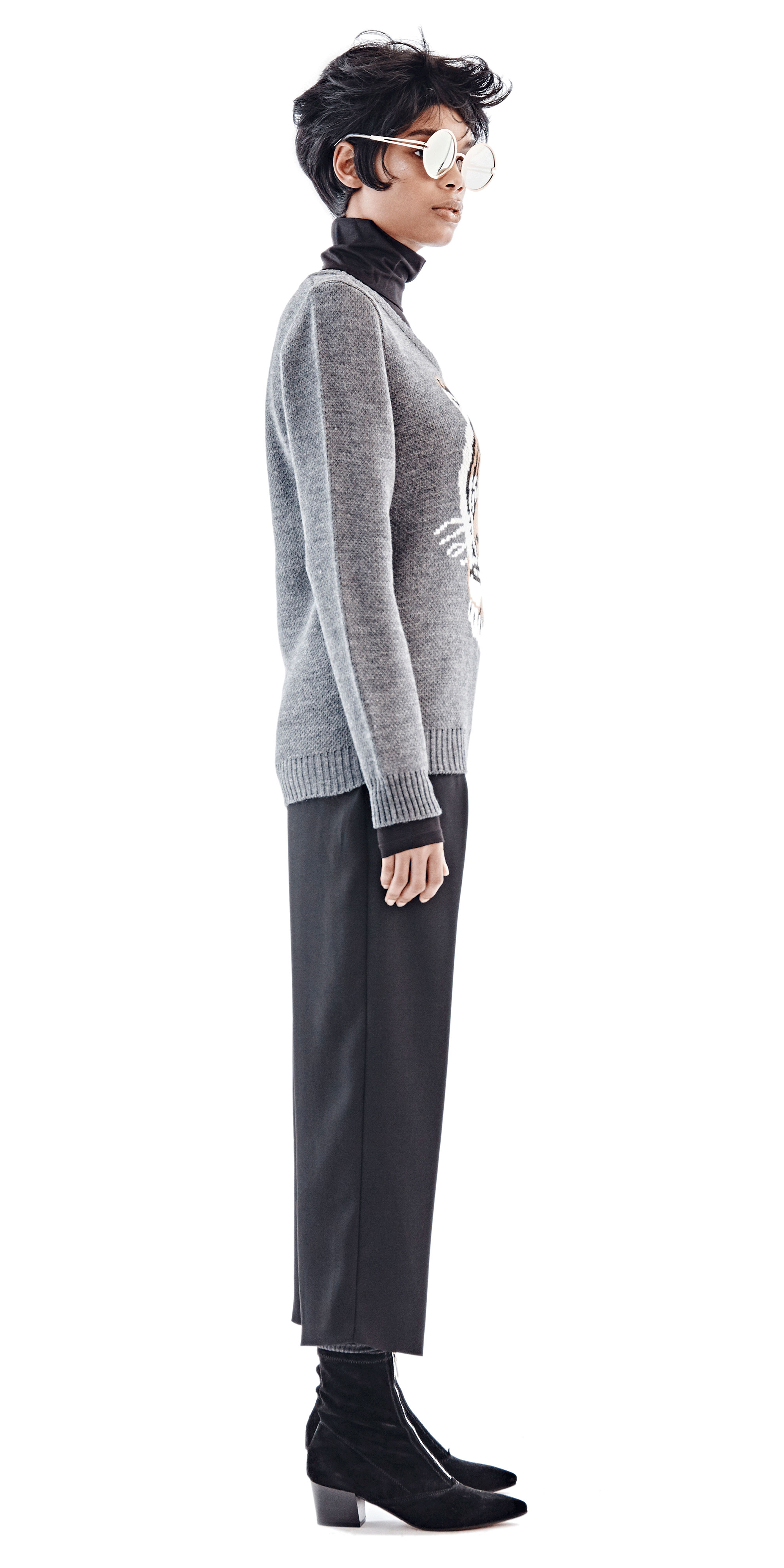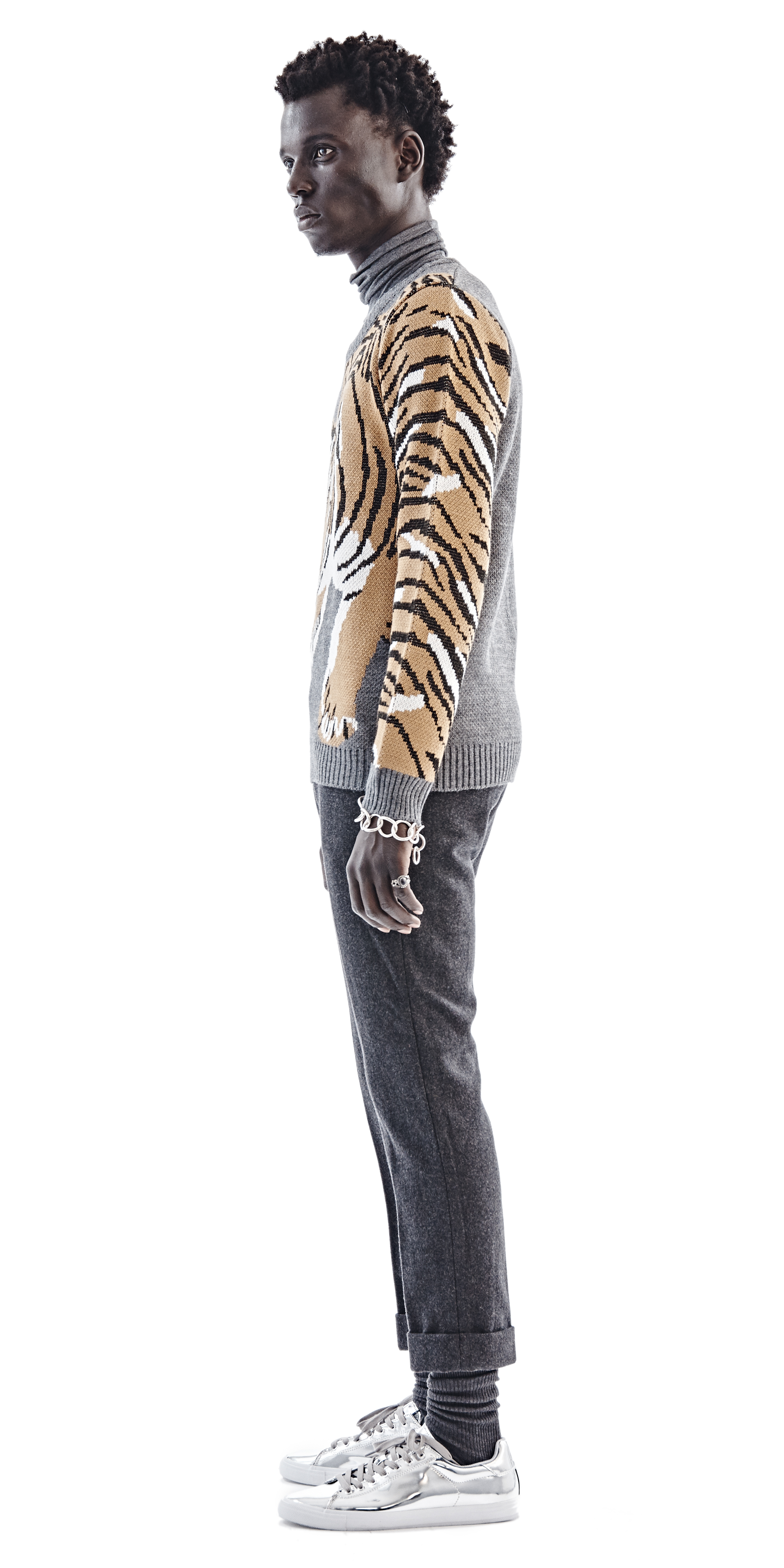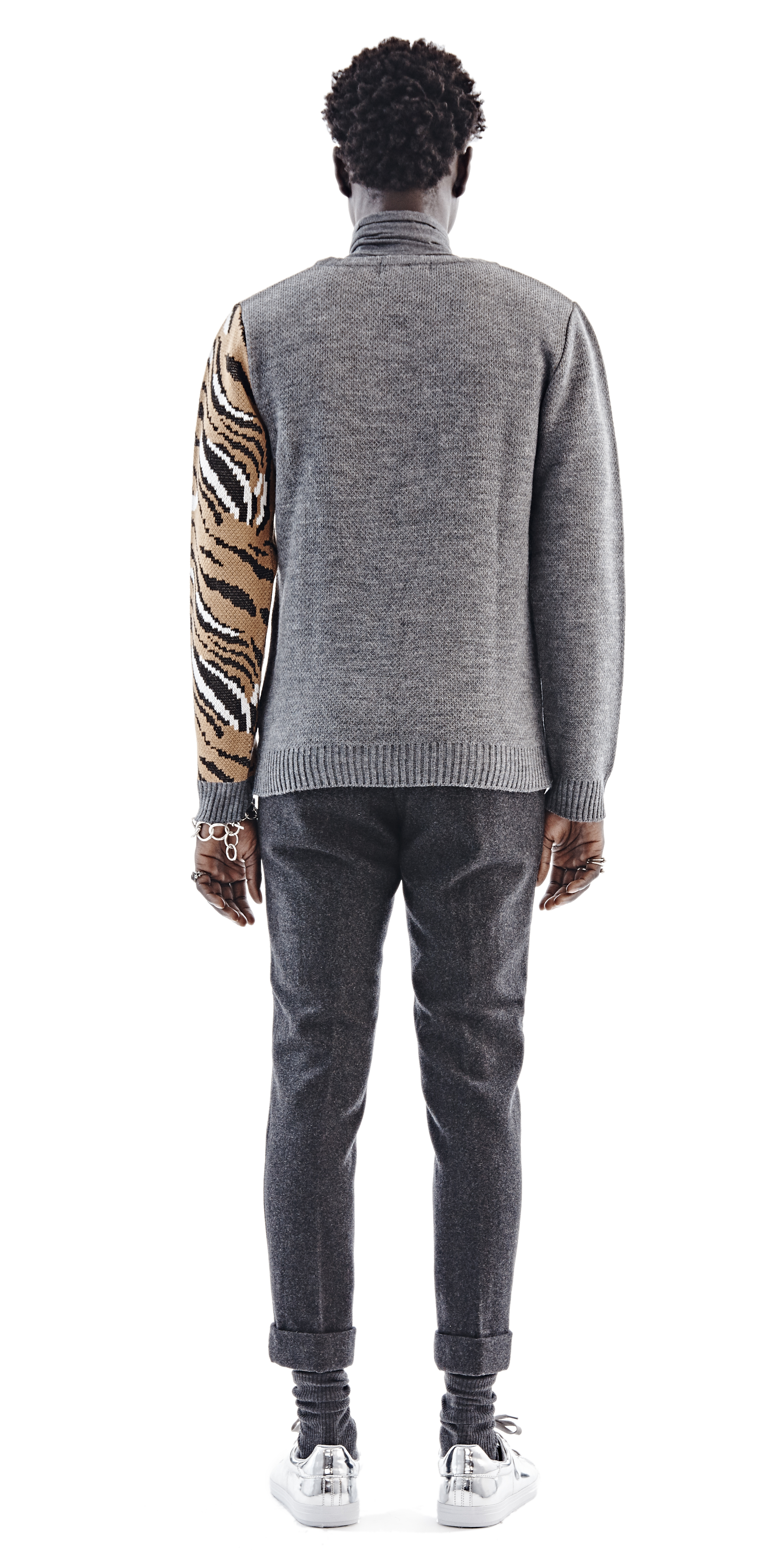 Chulaap Charcoal Tiger Sweater / u-neck collar / long-sleeves / knit tiger design / ribbed cuffs and hem / 100% acrylic / made in Cape Town, South Africa