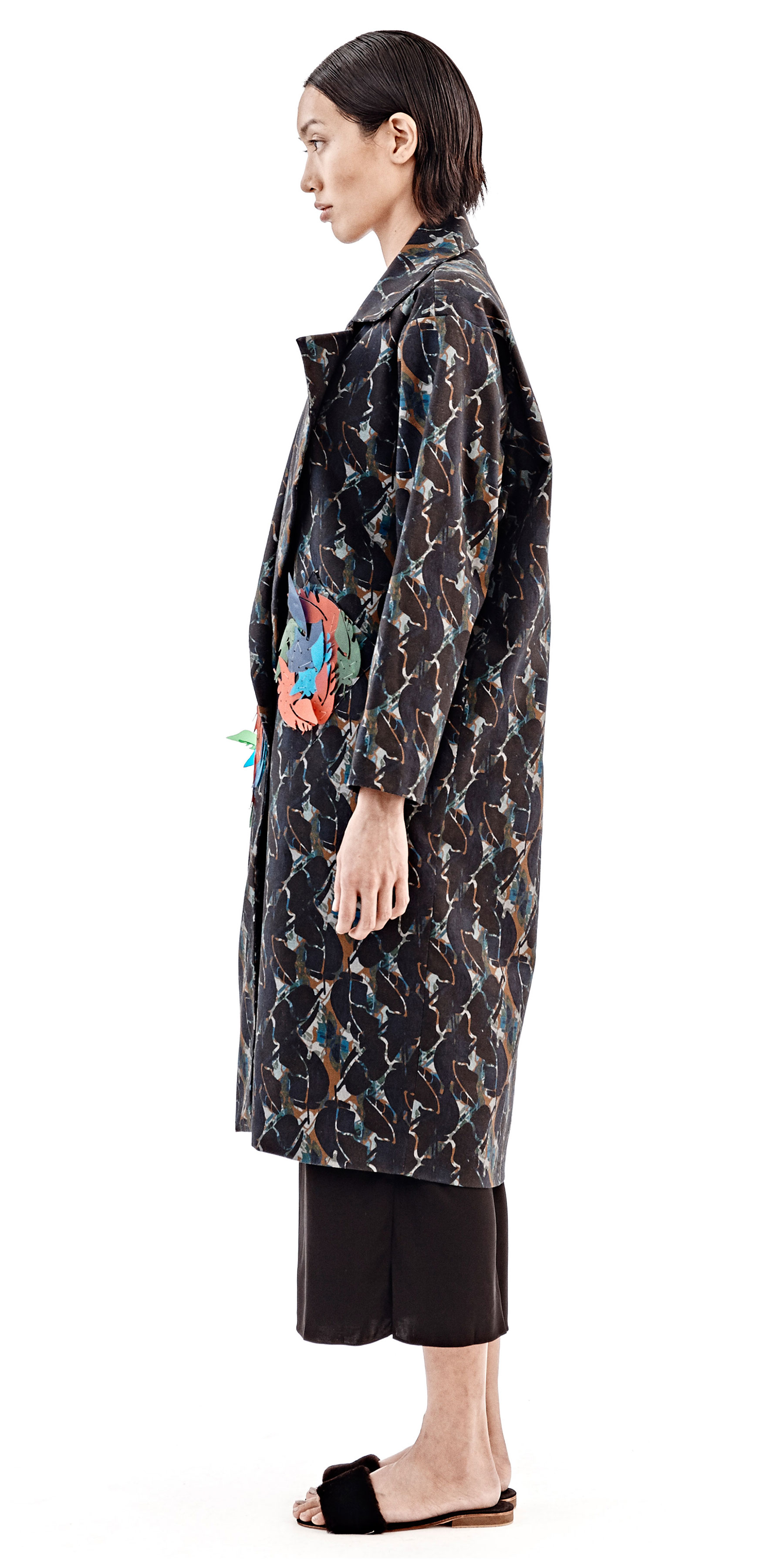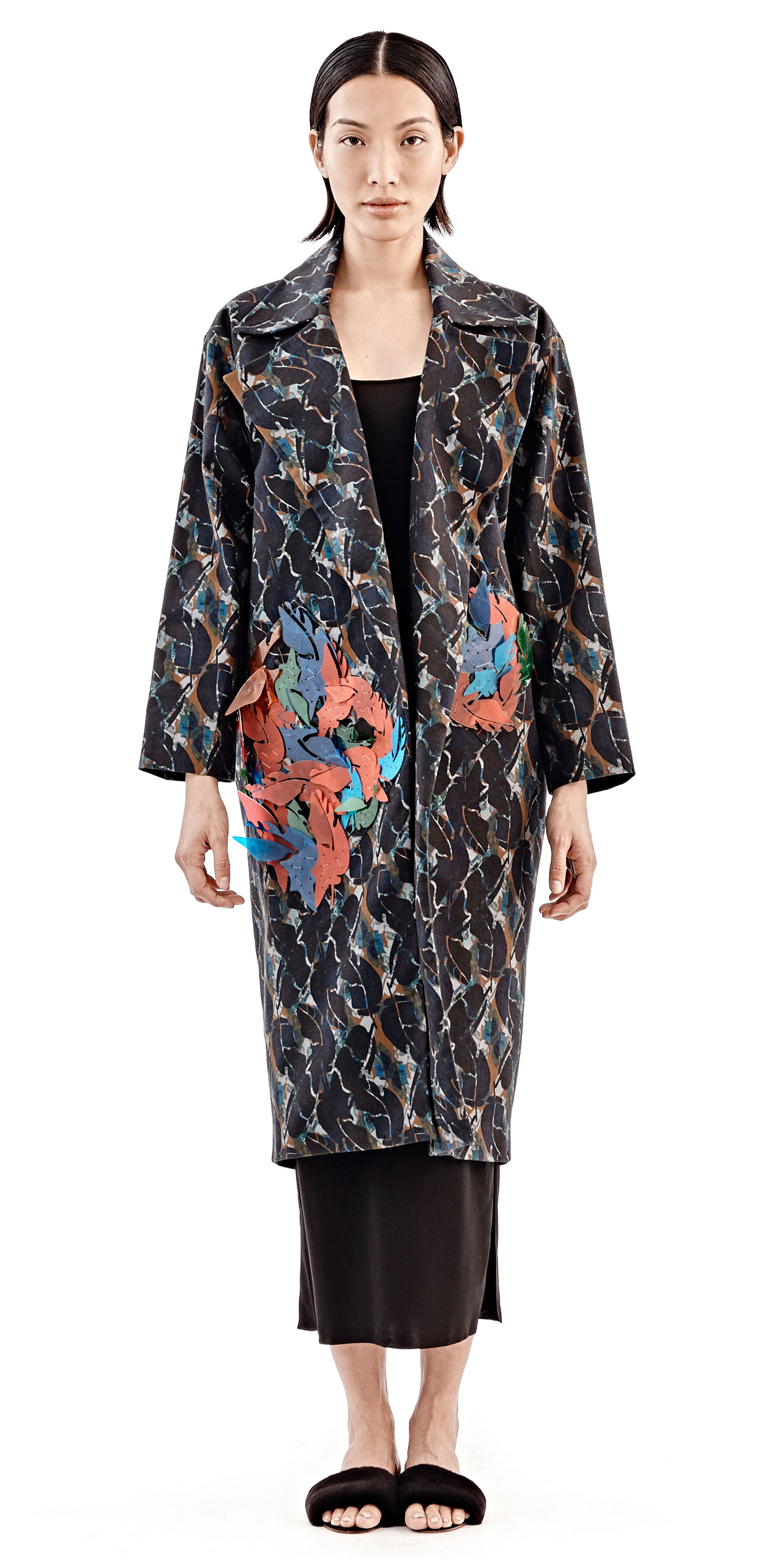 Lisa Folawiyo Fall Leaf Coat / long-sleeve oversized coat / leaf print throughout in hues of blue and brown / notch lapel / hanging leaf appliqués at front / button closure front / 100% cotton / made in Lagos, Nigeria